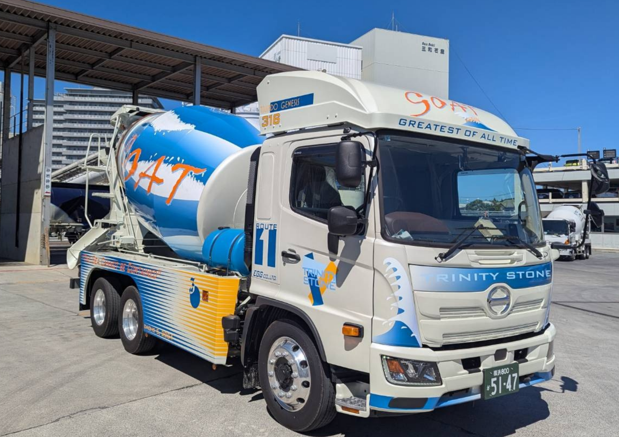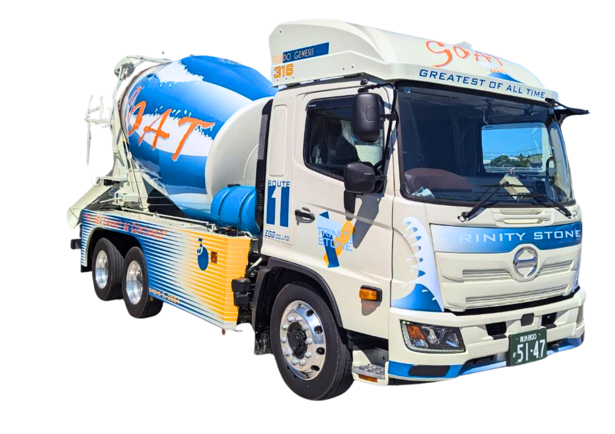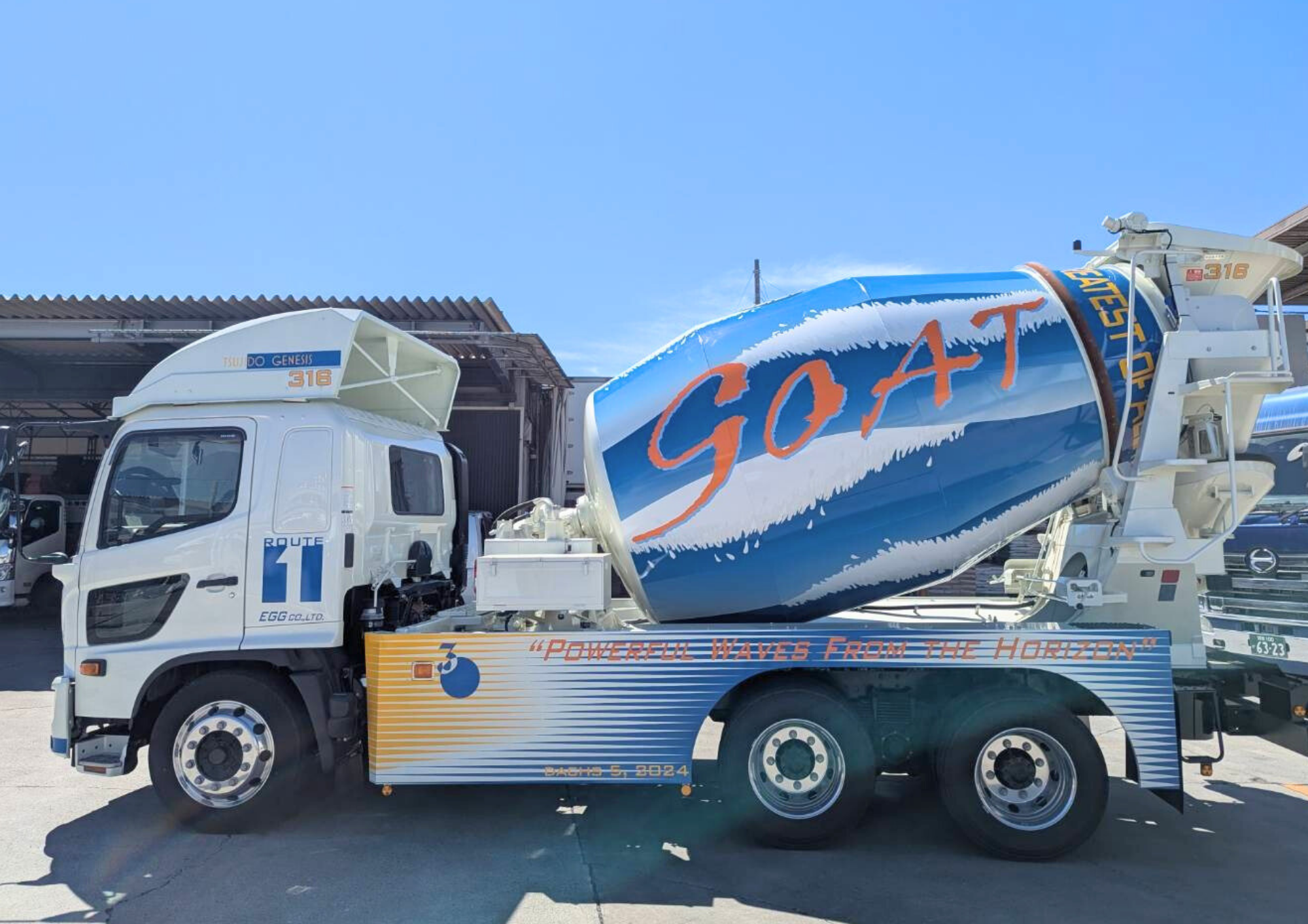 ちなみに、大きく書かれた「GOAT」という文字。 これ、最近の流行り言葉でもありますが、「Greatest Of All Time(史上最高!)」という意味なんです。 「最高にイケてるミキサー車!」というビックボスのメッセージが詰まっています。