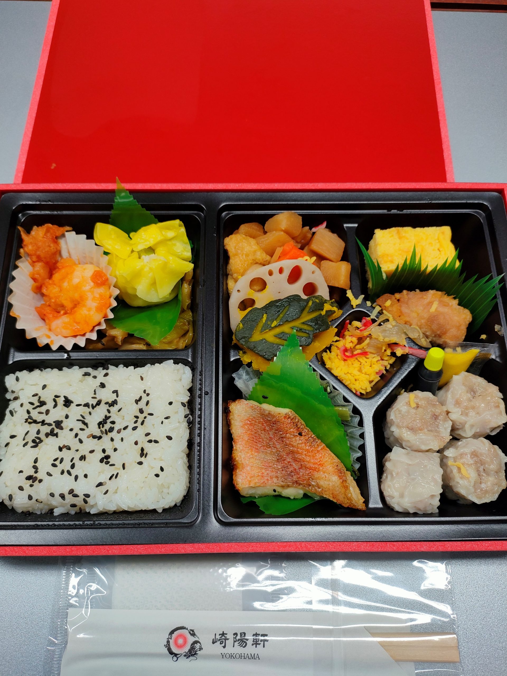 白飯(黒胡麻)、昔ながらのシウマイ 4個、海老のチリソース、黄華咲き蒸し、鶏の唐揚げ、厚焼き玉子、赤魚の塩焼き、筍煮、人参煮、春雨入り巾着煮、丸蓮根白煮、木の葉南瓜煮、小松菜のおひたし、ザーサイ、カニ風味蒲鉾とクラゲと錦糸玉子の酢の物
